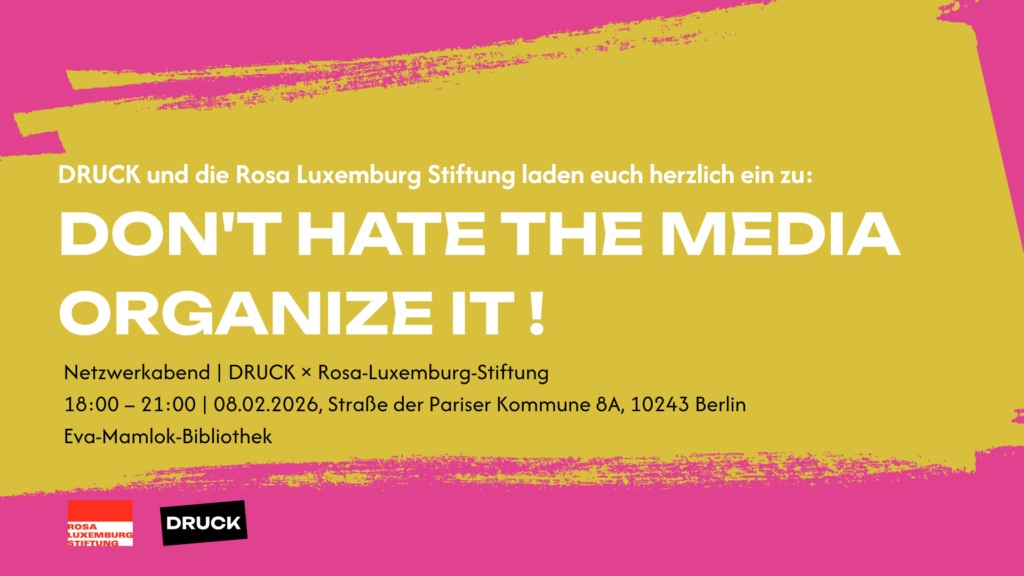 Don’t hate the media – organize it! Netzwerkabend | DRUCK × Rosa-Luxemburg-Stiftung | 18:00 – 21:00 | 08.02.2026, Straße der Pariser Kommune 8A 10243 Berlin Eva-Mamlok-Bibliothek 2026 lädt DRUCK gemeinsam